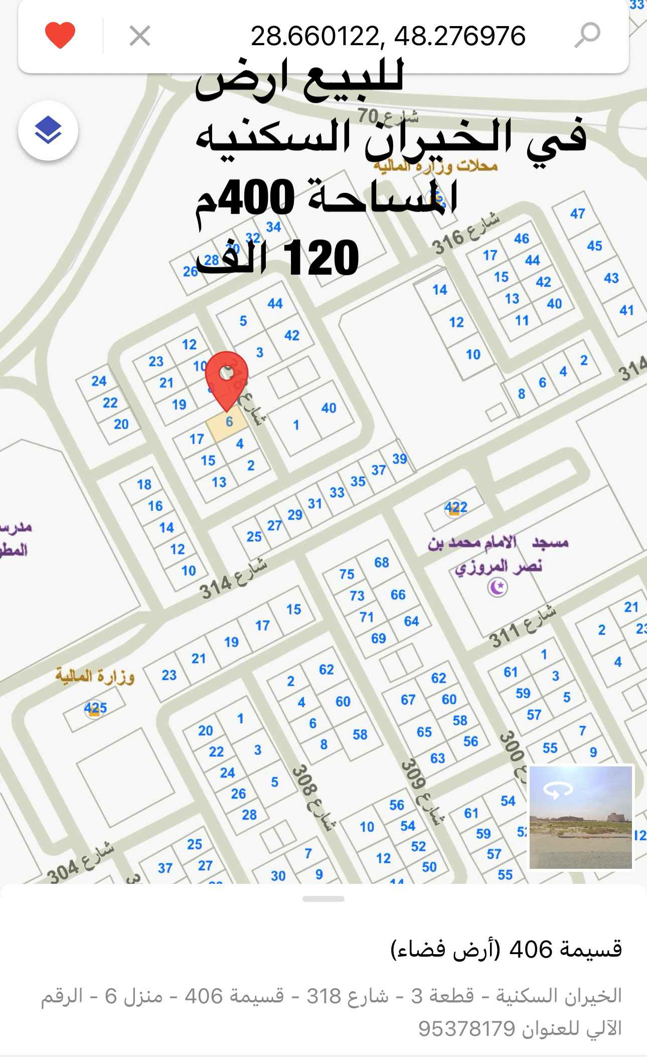 للبيع ارض في الخيران السكني المساحة 400م الموقع شارع وسكة عريضه