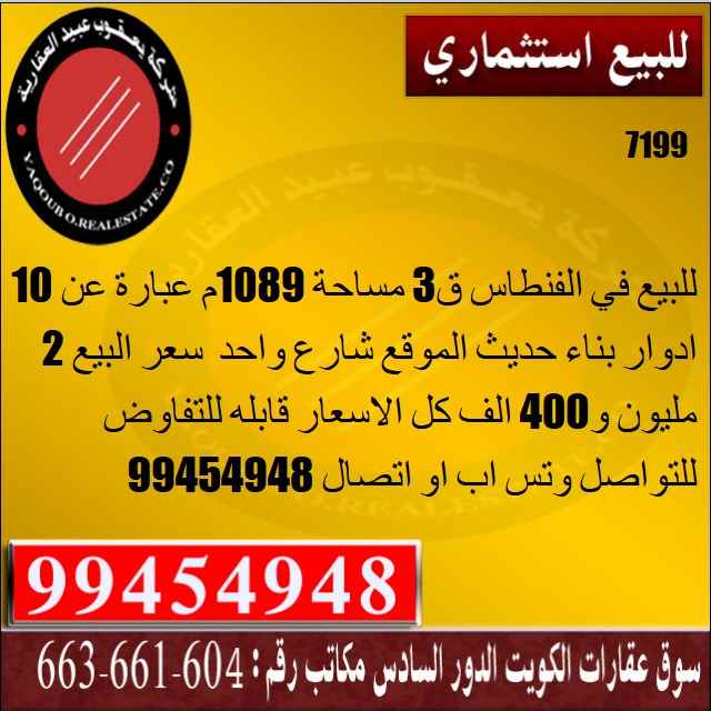 للبيع في الفنطاس ق3 مساحة 1089م عبارة عن 10 ادوار بناء حديث الموقع شارع واحد سعر البيع 2 مليون و400 الف