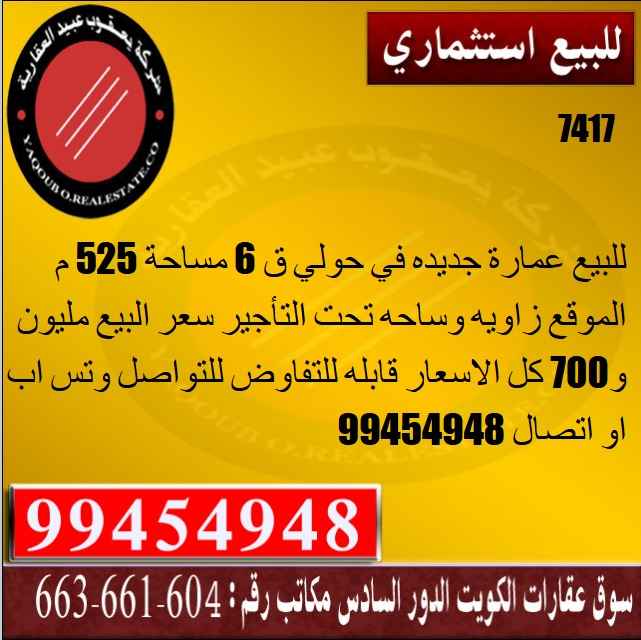 للبيع عمارة جديده في حولي ق 6 مساحة 525 م الموقع زاويه وساحه تحت التأجير سعر البيع مليون و700