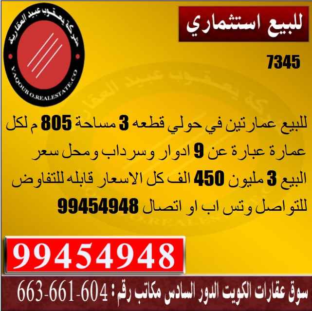 للبيع عمارتين في حولي قطعه 3 مساحة 805 م لكل عبارة عن 9 ادوار وسرداب ومحل سعر البيع 3 مليون 450 الف