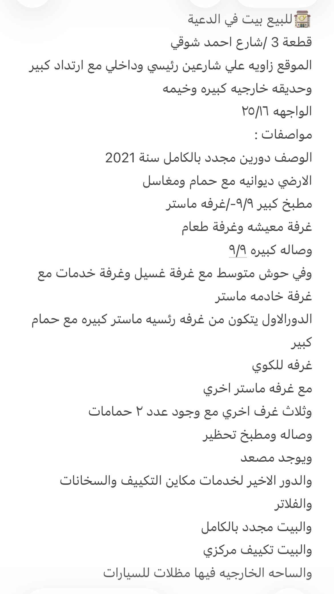 للبيع بيت في الدعية 400م زاوية ارتداد كبيره